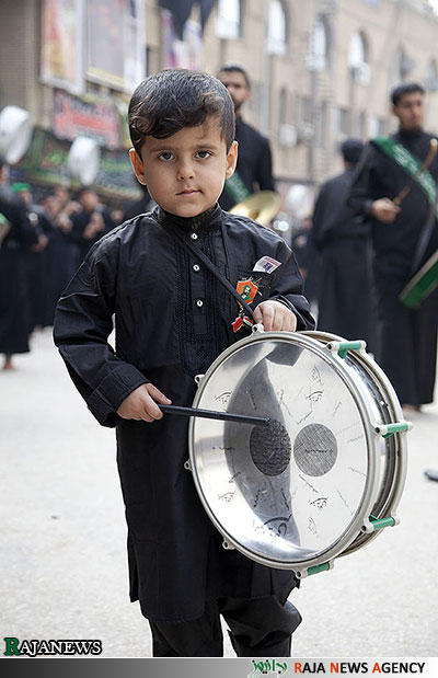 کودک عزادار در حال طبل زدن در دسته ی عزاداری