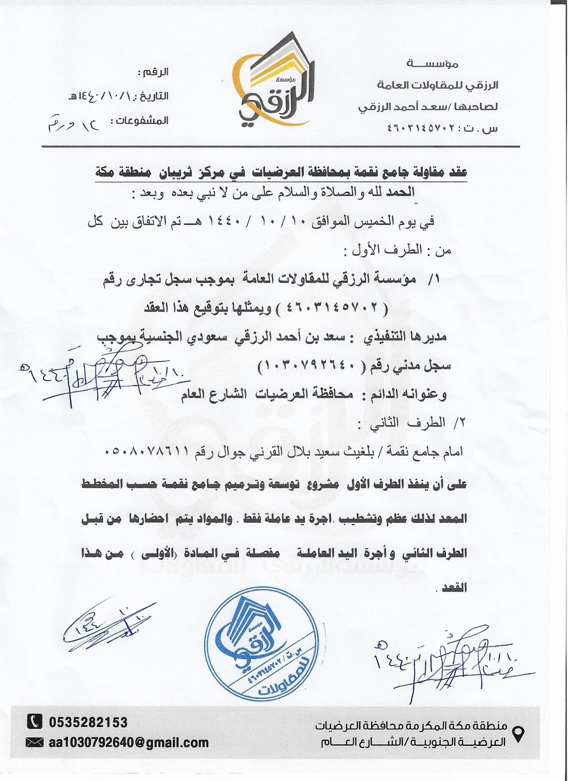 مدونة ابو عادل عقد توسعة وترميم جامع نقمة بمحافظة العرضيات تنفيذ مؤسسة الرزقي للمقاولات